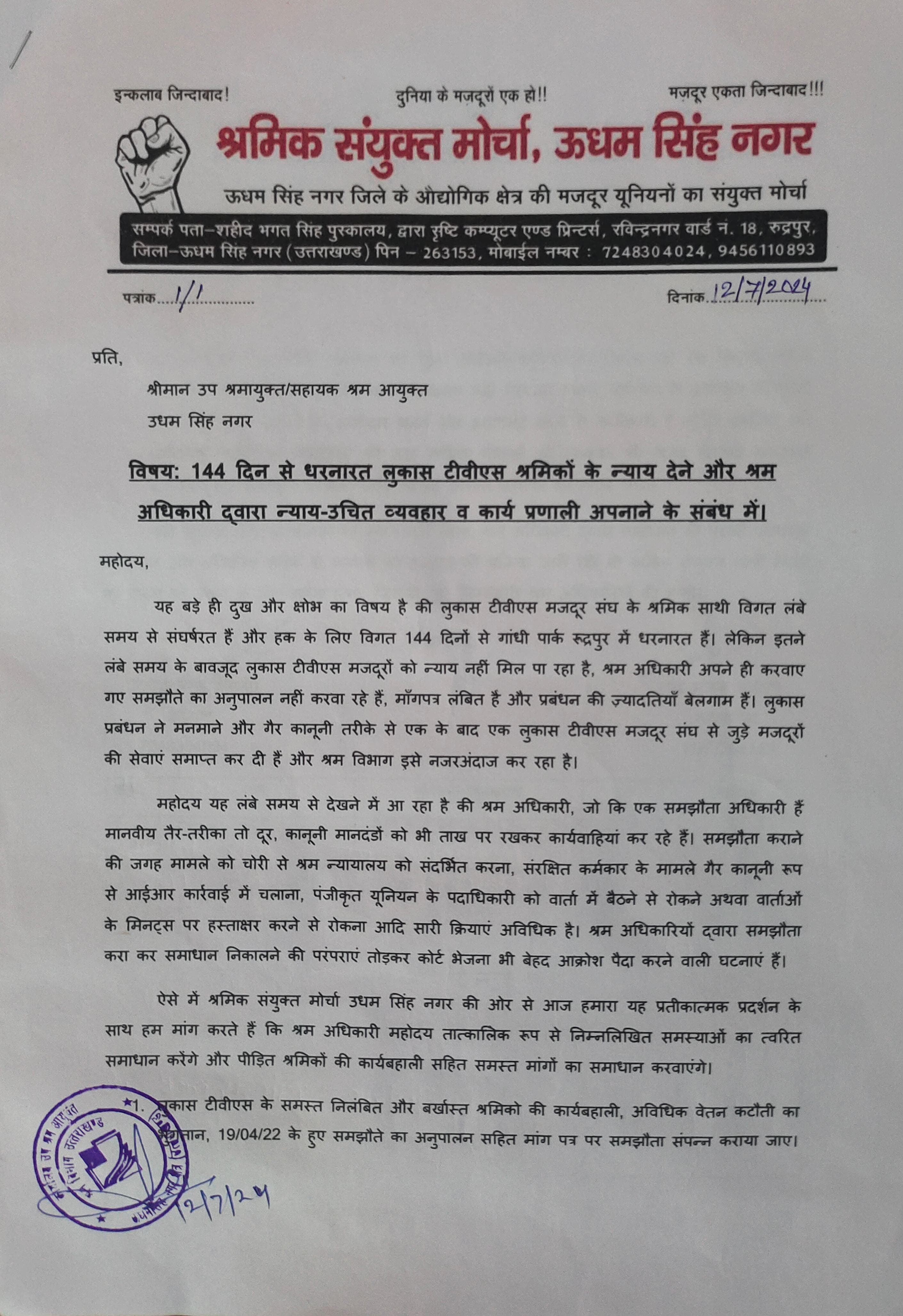इस दौरान वक्ताओं ने कहा कि लुकास टीवीएस मजदूर संघ के श्रमिक साथी विगत लंबे समय से संघर्षरत हैं और हक के लिए विगत 144 दिनों से गांधी पार्क रूद्रपुर में धरनारत हैं। लेकिन इतने लंबे समय के बावजूद लुकास टीवीएस मजदूरों को न्याय नहीं मिल पा रहा है, श्रम अधिकारी अपने ही करवाए गए समझौते का अनुपालन नहीं करवा रहे हैं, माँगपत्र लंबित है और प्रबंधन की ज़्यादतियाँ बेलगाम हैं। लुकास प्रबंधन ने मनमाने और गैर कानूनी तरीके से एक के बाद एक लुकास मजदूरों की सेवाएं समाप्त कर दी हैं और श्रम विभाग इसे नजरअंदाज कर रहा है।