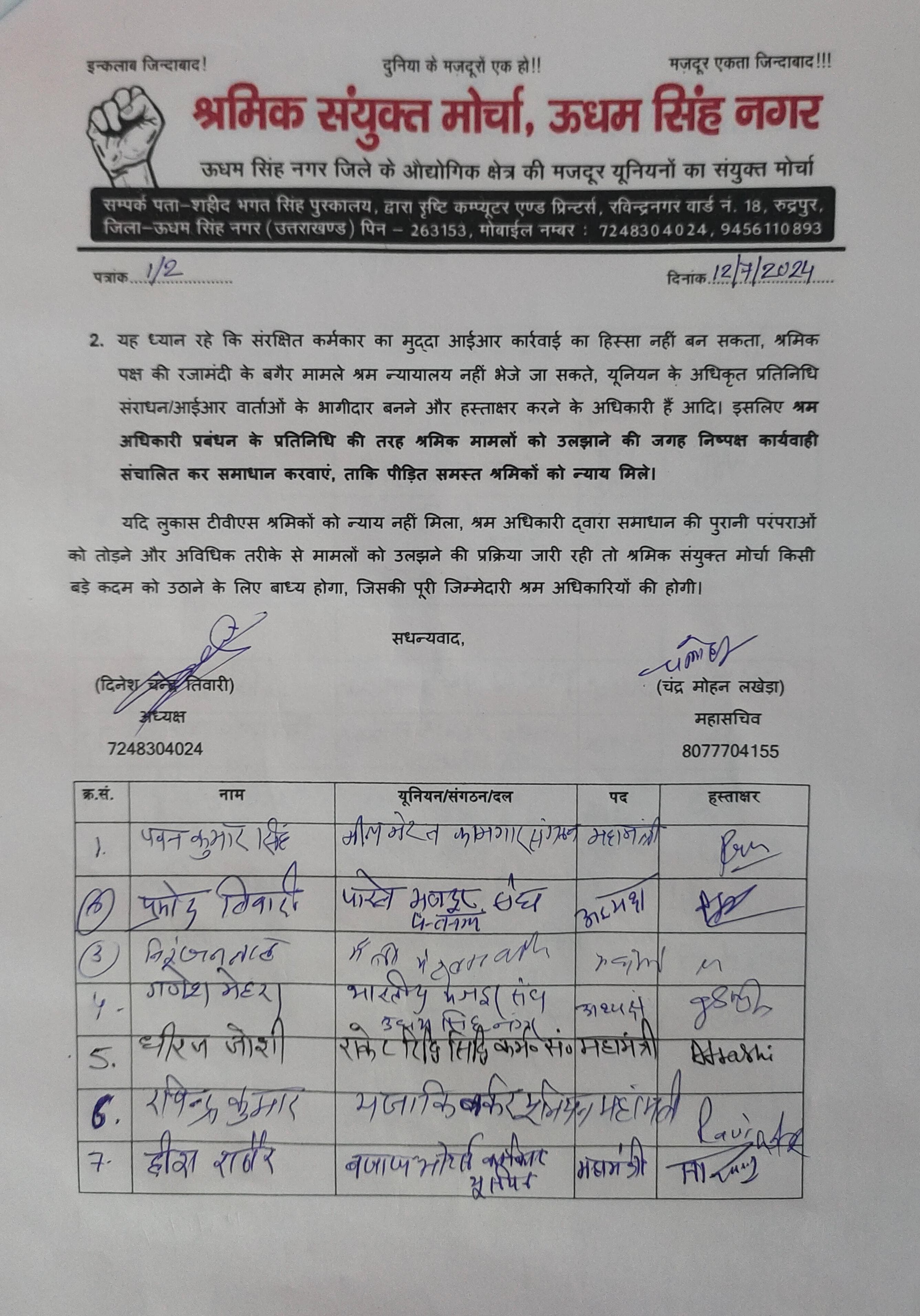 रुद्रपुर (उत्तराखंड)। लुकास टीवीएस मज़दूरों को न्याय देने और एएलसी द्वारा श्रमिकों से न्याय-उचित व्यवहार करने के लिए 12 जुलाई को श्रमिक संयुक्त मोर्चा के नेतृत्व में सैकड़ों मज़दूरों ने सिड़कुल नेस्ले चौक से श्रम भवन तक जुलूस निकाला और श्रम भवन पर प्रदर्शन के साथ सहायक श्रमायुक्त महोदय को ज्ञापन दिया।
