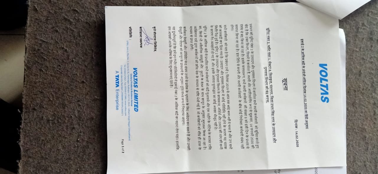वोल्टास प्रबंधन द्वारा जारी प्लांट 2 में उत्पादन बंद होने का नोटिस