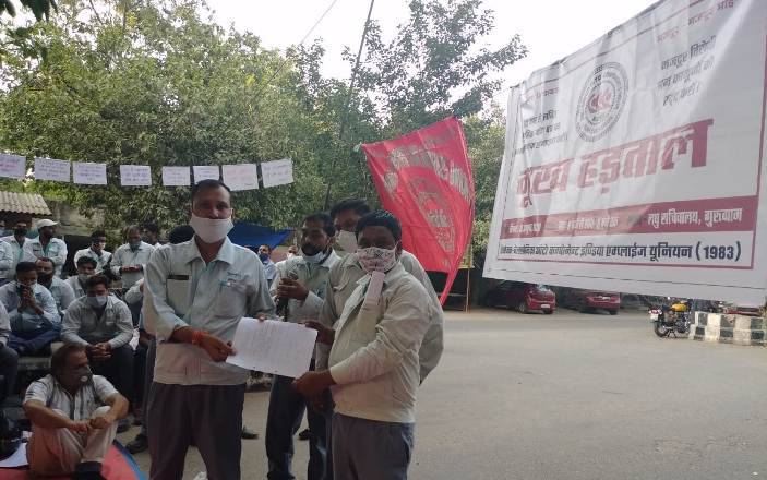 गुडगाँव 15 अक्टूबर। बेलसोनिका ऑटो कॉम्पोनेन्ट इंडिया एम्प्लाइज यूनियन ने अपनी मांगों को लेकर 8 घंटे की सामूहिक भूख हड़ताल मिनी सचिवालय गुड़गांव में की। भूख हडताल के बाद यूनियन ने ठेका मजदूरो को सदस्यता दी। भूख हड़ताल की मुख्य माँगों में 44 केंद्रीय श्रम कानूनों को खत्म कर 4 श्रम सहिंताओ में घोर मजदूर विरोधी बदलाव ख़त्म करने तथा 20 माह से लंबित सामूहिक मांग पत्रों को हल करने की थी।