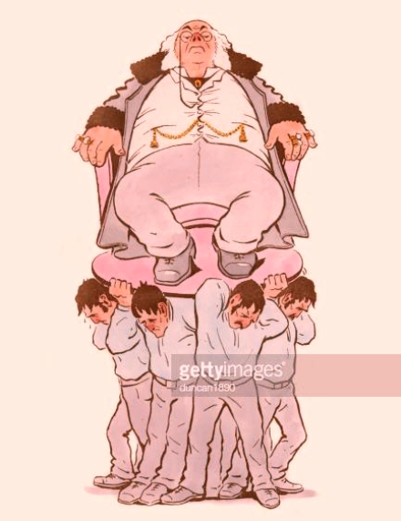 Vintage engraving of a Victorian satire on capitalism and labour. A greed capitalist boss carried on the backs of his workers. 1890