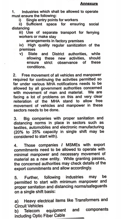 • उद्योगों को चलाने के लिए वाहनों और श्रमिकों की आवाजाही में कोई परेशानी न हो। कर्मचारियों और माल की आवाजाही पर निगरानी रखने वाला अमला गृह मंत्रालय के निर्देशों का पूरी तरह पालन करे। श्रमिकों और माल की खुली आवाजाही हो।