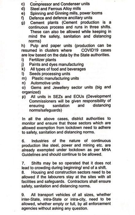 ऑटो मोबाइल क्षेत्र की इकाइयां; रत्न और आभूषण निर्माण की इकाइयां (बड़े और संगठित क्षेत्र में); सभी एसईजेड और विशेष आर्थिक जोन में उत्पादन की इजाजत रहेगी।
