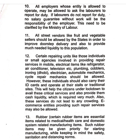 इसके तहत 15 उद्योग समूहों की एक सूची जारी करके उद्योग संचालन के लिए एक दिशानिर्देश तय किया है। उसमें साफ़ किया है कि जिनका नाम काम करने वालों की सूची में होगा, वे यदि अपने काम पर उपस्थित नहीं होते हैं, तो उनको वेतन देने की ज़िम्मेदारी नियोक्ता की नहीं होगी।