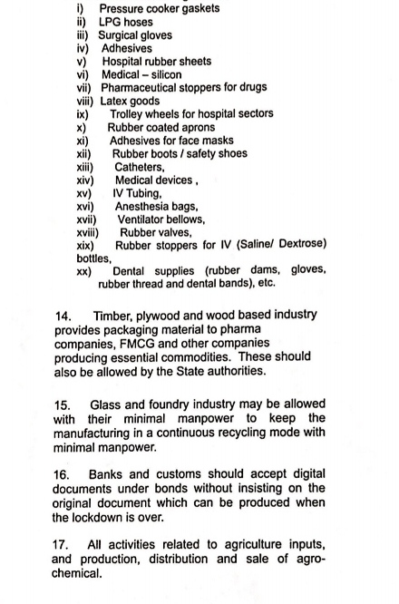 लकड़ी का पल्प और कागज निर्माण इकाइयां (जहाँ कोरोनावायरस के मामले कम आए हो); उर्वरक प्लांट; पेंट और डाई उत्पादन की इकाइयां; सभी प्रकार के खाने-पीने की वस्तुएं; प्लास्टिक उत्पादन इकाइयां; बीज प्रोसेसिंग इकाइयां।