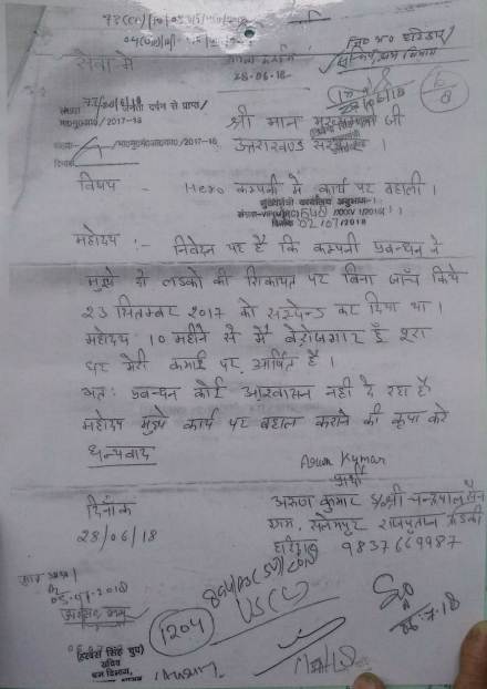 श्रमिक अरुण कुमार सैनी ने ‘मेहनतकश’ को बताया कि वे 11 वर्षों से हीरो मोटोकॉर्प कंपनी हरिद्वार में कार्य कर रहा था। मात्र 2 लड़कों की शिकायत पर कंपनी प्रबंधन ने उनको 23 सितम्बर, 2017 को फर्जी आरोपों में निलंबित किया और फर्जी जाँच कर उन्हें बर्खास्त कर दिया।