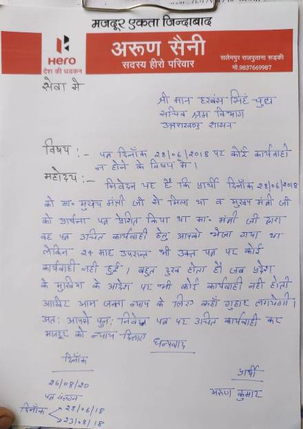 अरुण सैनी का कहना है कि जब सूबे के मुख्यमंत्री के आदेशों को ही अधिकारी नहीं मानते तो आम जनता न्याय के लिए कहाँ जाएगी? आम जनता का सरकार से विश्वास उठ जाएगा। इस संदर्भ में 26 अगस्त को प्रार्थी अरुण सैनी ने श्रम सचिव उत्तराखंड को एक चिट्ठी लिखकर न्याय की गुहार लगाई है।