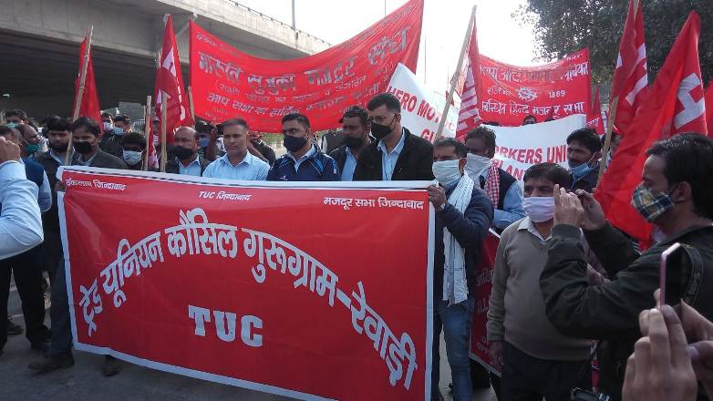 गुडगाँव। मारुति सुजुकी मज़दूर संघ व ट्रेड यूनियन काउंसिल के आहवान पर भारत बंद व किसान आंदोलन के समर्थन में गुड़गांव के मज़दूर संगठनों ने हीरो चौक पर इकट्ठा होकर लगभग 5 किलोमीटर दिल्ली जयपुर हाईवे NH 8 राजीव चौक तक जुलूस निकाला।