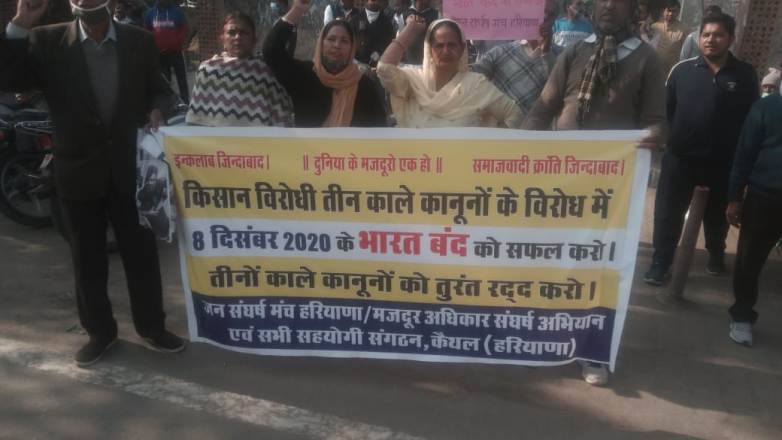 कैथल। जन संघर्ष मंच हरियाणा (घटक मासा), मनरेगा मज़दूर यूनियन, निर्माण कार्य मज़दूर मिस्त्री यूनियन एवं आंगनवाड़ी वर्कर्स एंड हेल्पर यूनियन द्वारा संयुक्त रुप से भारत बंद में शामिल होकर शहर के प्रमुख जवाहर पार्क में जोरदार प्रदर्शन किया और भारतीय किसान यूनियन द्वारा आयोजित सभा में मांगों का जोरदार समर्थन किया गया।