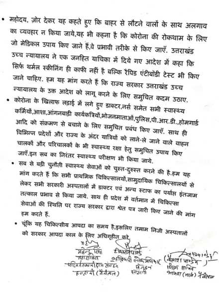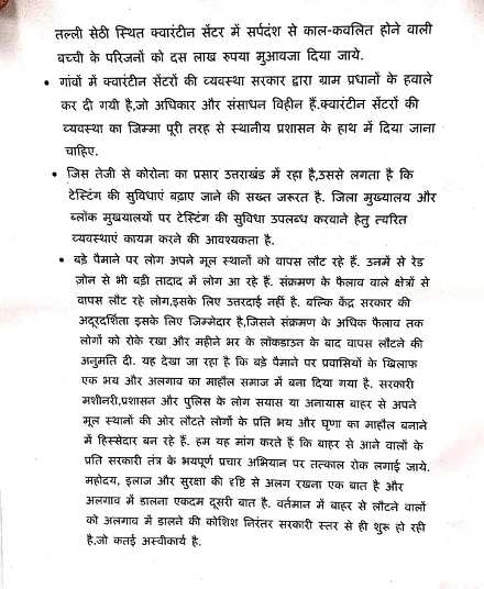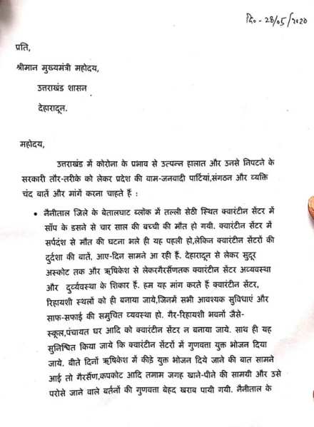मुख्यमंत्री को भेजे गए ज्ञापन में, नैनीताल के तल्ली सेठी स्थित क्वॉरेंटाइन सेंटर में सर्पदंश से एक बच्ची की मौत सहित तमाम दुर्दशाओं का जिक्र करते हुए क्वॉरेंटाइन सेंटर रिहायशी स्थलों को ही बनाए जाने, जिनमें सभी आवश्यक सुविधाएं और साफ सफाई की समुचित व्यवस्था हो, गैर रिहायशी भवनों जैसे स्कूल पंचायत घर आदि को कोरेंटिन सेंटर न बनाए जाने की मांग की गई।