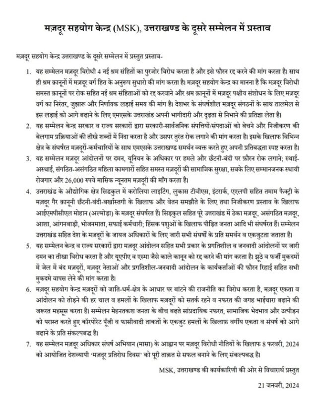 - यह सम्मेलन मज़दूर विरोधी 4 नई श्रम संहितों का पुरजोर विरोध करता है और इसे फौरन रद्द करने की मांग करता है। साथ ही श्रम क़ानूनों में मज़दूर वर्ग हित के अनुरूप सुधारो की मांग करता है। मज़दूर सहयोग केन्द्र का मानना है कि मज़दूर विरोधी समस्त क़ानूनों पर रोक सहित नई श्रम संहिताओं को रद्द करवाने और श्रम क़ानूनों में मज़दूर पक्षीय संशोधन के लिए मज़दूर वर्ग का निरंतर, जुझारू और निर्णायक लड़ाई समय की मांग है। देशभर के संघर्षशील मज़दूर संगठनों के साथ तालमेल से इस लड़ाई को आगे बढ़ाने के लिए एमएसके उत्तराखंड अपनी भागीदारी और दृढ़ता से निभाने की प्रतिज्ञा लेता है।