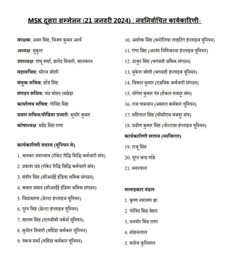 संग्रामी एकजुटता के साथ नई कार्यकारिणी का गठन; 7 सूत्री प्रस्ताव पारित। मासा के आह्वान पर 8 फरवरी को अखिल भारतीय मज़दूर प्रतिरोध दिवस पर एकजुट प्रदर्शन का आह्वान।