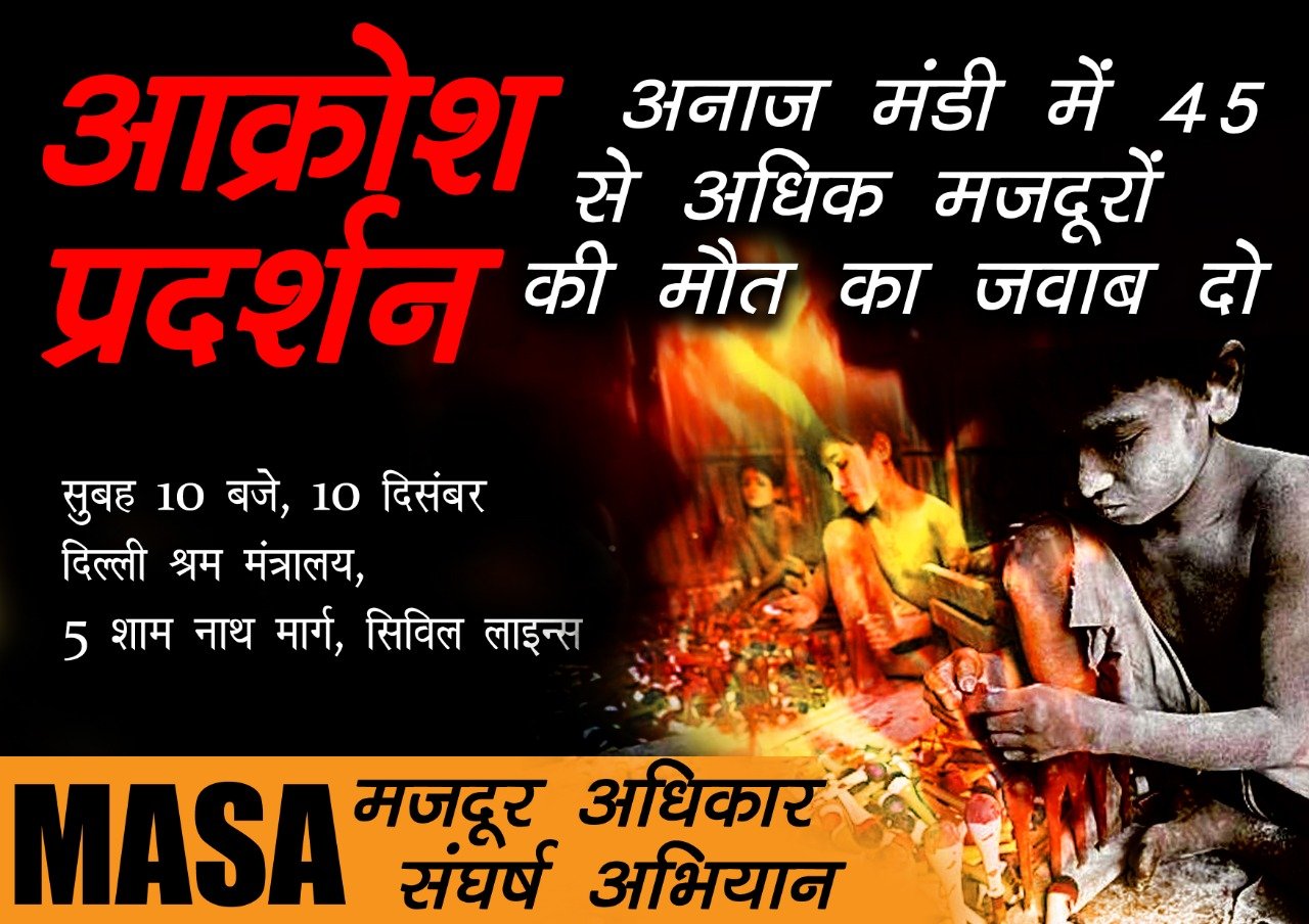 दिल्ली अनाज मंडी में केंद्र सरकार, केजरीवाल सरकार व एम सी डी प्रशासन की आपराधिक लापरवाही और अवैध फैक्टरी मालिकों के साथ गठजोड़ के चलते आग में 45 से ज्यादा मज़दूरों की भयावह मौत का जवाब दो।