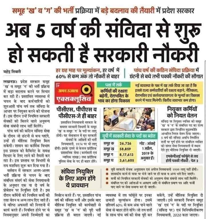 उत्तर प्रदेश की योगी सरकार समूह ‘ख’ व समूह ‘ग’ की भर्ती प्रक्रिया में बड़ा बदलाव करने पर विचार में कर रही है। प्रस्तावित व्यवस्था में चयन के बाद कर्मचारियों को शुरुआती पांच वर्ष तक संविदा के आधार पर नियुक्त करने की योजना है। इस दौरान उन्हें नियमित सरकारी सेवकों को मिलने वाले अनुमन्य सेवा संबंधी लाभ नहीं मिलेंगे।
