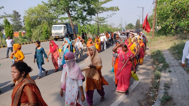 श्रमिक समस्याओं को लेकर मज़दूरों-किसानों की महिलाओं-बच्चों संग जोरदार पदयात्रा