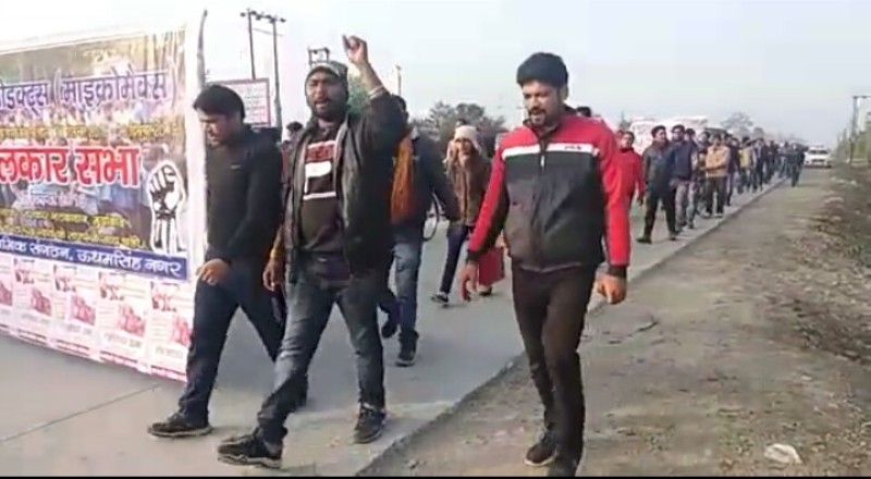 पंतनगर, 27 दिसम्बर। भगवती प्रॉडक्ट्स (माइक्रोमैक्स) में श्रमिकों की गैरकानूनी छँटनी-बंदी के एक साल पूरा होने पर कंपनी गेट पर मज़दूरों ने जोरदार ’ललकार सभा’ की और रैली की अनुमति नहीं मिलने के बावजूद कंपनी गेट सिडकुल से श्रम भवन तक रैली निकालकर संघर्ष के जज्बे का प्रदर्शन किया। कार्यक्रम में सिडकुल के मज़दूरों ने भरपूर भागीदारी की।