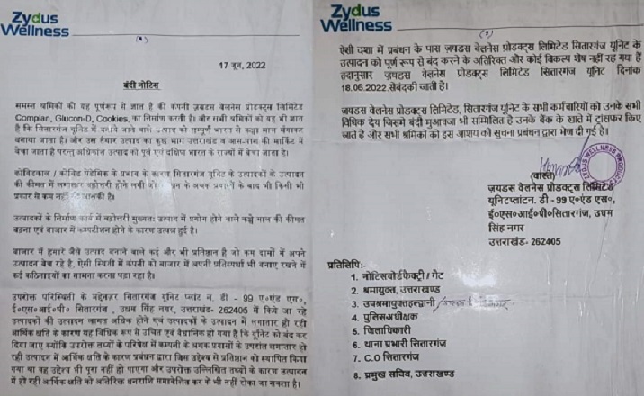 आर्थिक कारणों का हवाला देते हुए सितारगंज यूनिट को बंद करना बताया गया है और जयडस वैलनेस कि सितारगंज यूनिट को दिनांक 18/06/2022 से पूर्ण रुप से बंद करने की घोषणा की गई है।